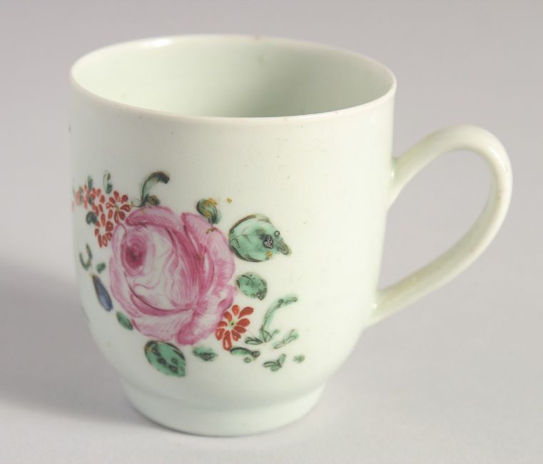 A LIVERPOOL CHAFFERS FACTORY COFFEE CUP AND SAUCER painted in colour with a large rose.