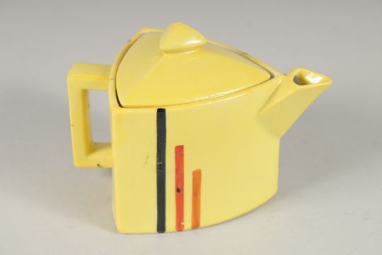 AN ART DECO YELLOW TEA SET, comprising large tea pot, small tea pot, sugar bowl, six cups and saucers.