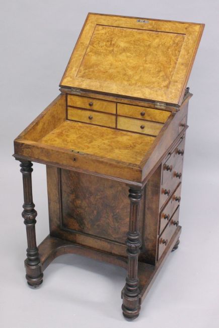 A GOOD VICTORIAN FIGURED WALNUT DAVENPORT by EDWARDS & ROBERTS with brass grill, tapering leather writing surface opening to reveal four small interior drawers. The side with brushing slide and four long drawers with wood handles, on bun feet and casters.