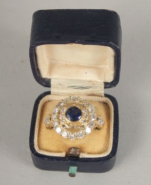 A VERY GOOD 18CT GOLD SAPPHIRE AND DIAMOND CIRCULAR CLUSTER RING.
