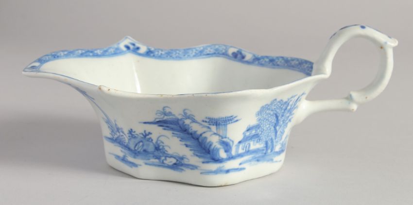 AN EARLY BOW FLAT BASE SAUCEBOAT painted with Chinese landscapes in blue.
