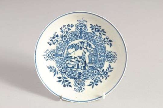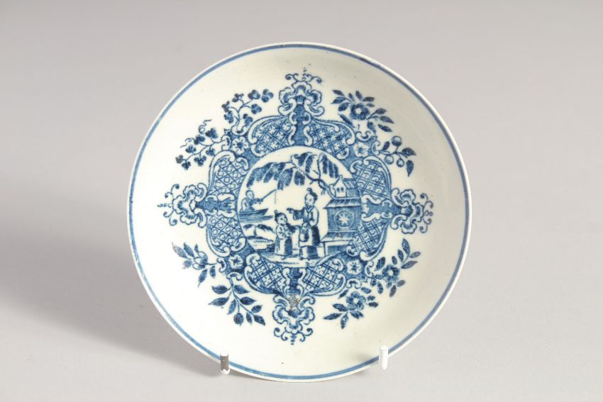 A LIVERPOOL TEABOWL AND SAUCER printed in blue with a mother child and man fishing, after Worcester.