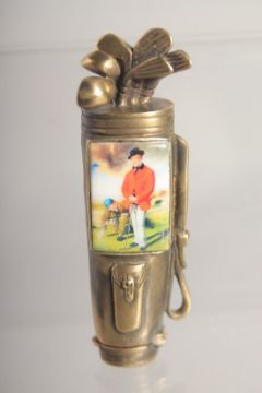 A BRASS AND ENAMEL GOLF BAG VESTA.