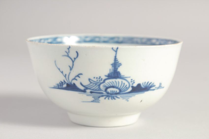 A LIVERPOOL TEABOWL AND SAUCER painted in blue with the Peony Bamboo and Fence pattern.