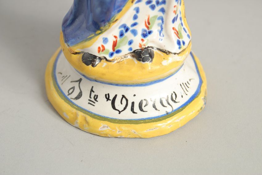 AN 18TH CENTURY FAIENCE POTTERY FIGURE, Madonna and child.