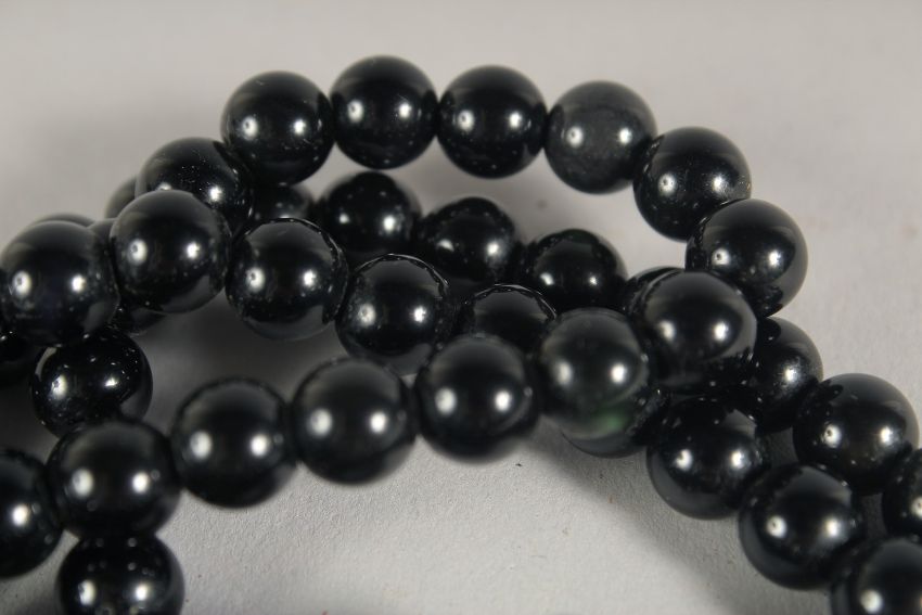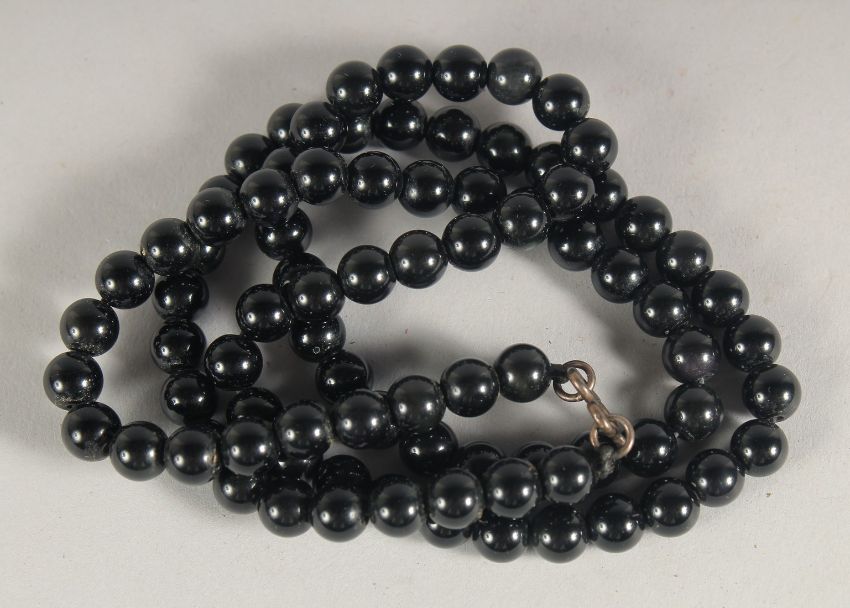 A STRING OF BLACK JET BEADS.