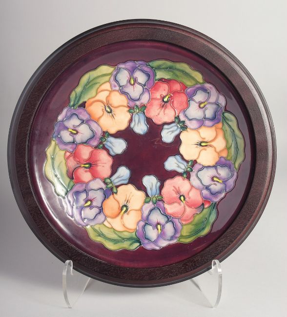 MOORCROFT PANSY DESIGN PLATE in an oak frame.
