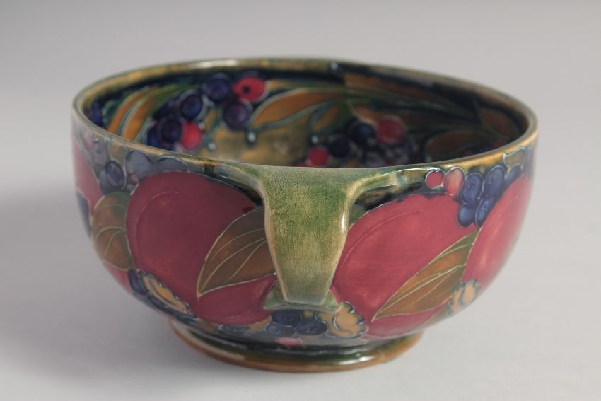 WILLIAM MOORCROFT POMEGRANATE DESIGN CIRCULAR TWO HANDLED BOWL on a green ground.