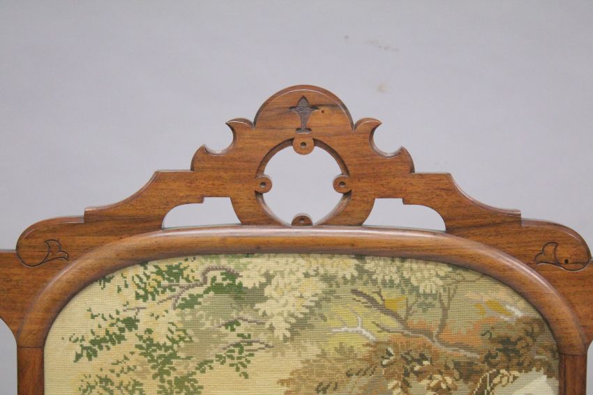 Needlework: 36ins x 18ins, supported on a turned frame, with curving legs.