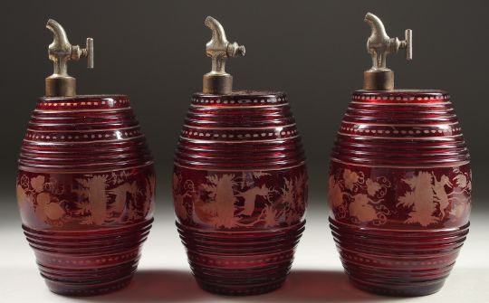 A SET OF THREE BOHEMIAN RUBY GLASS BARRELS engraved with deer and dogs, with chrome tops.