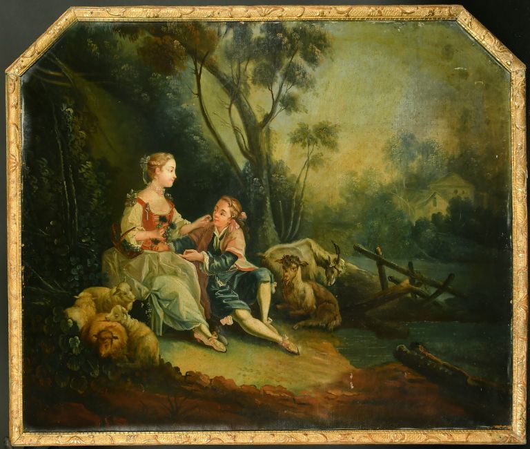 Manner of Watteau, An elegant couple seated sharing grapes in a classical landscape with sheep and goats, oil on canvas, 30" x 36.5", (76x93cm).