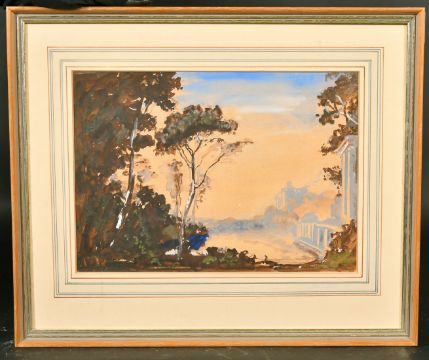 Circle of Felix Kelly (c.1950's) a classical set design, landscape with classical buildings, Watercolour with pen and ink, 7.75" x 10.75", (19.5x27.5cm).