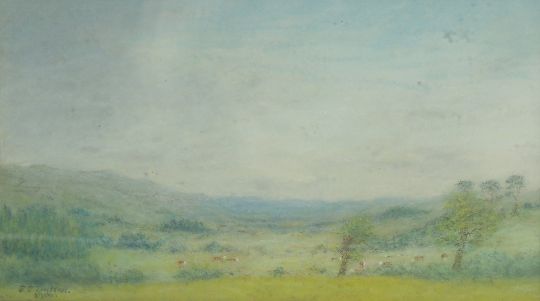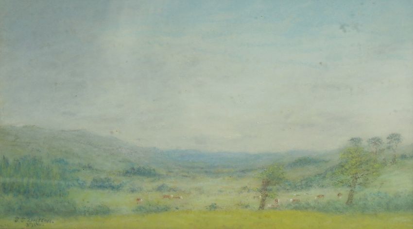 S.J. Dutton (19th /20th Century) Three landscapes, 'A river scene, 6.75" x 9.75", (17x24.5cm) in a Welsh valley, 6" x 11", (15x28cm) a highland pasture scene, 6" x 11.25", (15.5x29cm), all pastels, signed and inscribed verso, two with The Pastel Society label verso. (3).