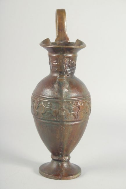 AN EARLY CLASSICAL BRONZE EWER, with a band of archaic style figures to the body, 35cm high.