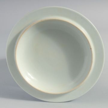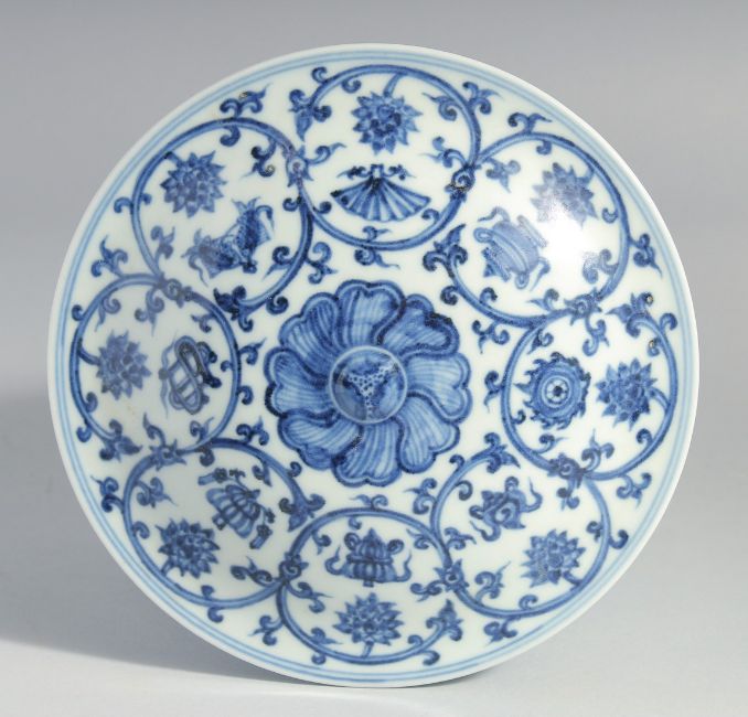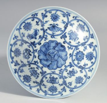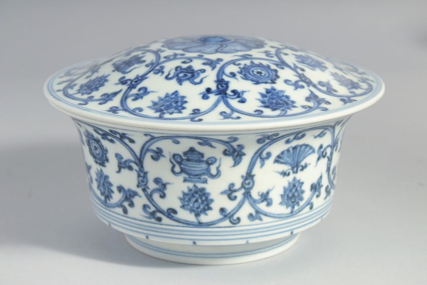 A CHINESE MING STYLE BLUE AND WHITE PORCELAIN BOWL AND COVER, the interior with six-character mark, 18.5cm diameter.