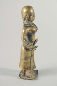 A RARE 17TH CENTURY MUGHAL INDIAN HOLLOWED BRONZE FIGURE of a female warrior, 13.5cm high.