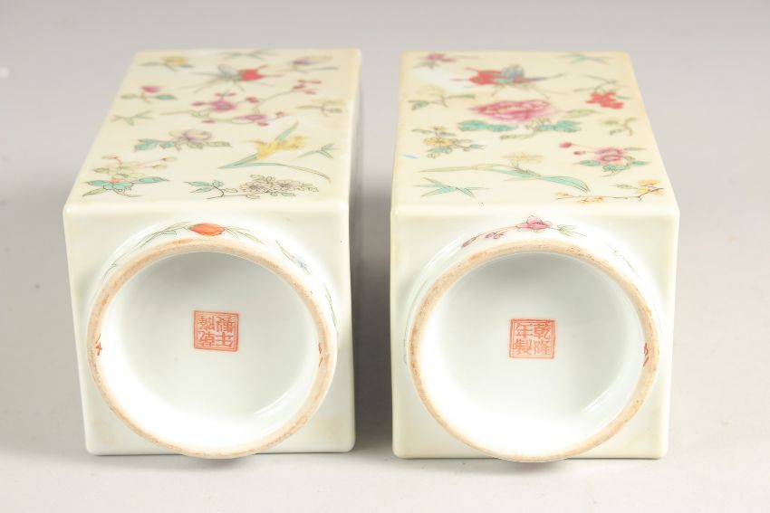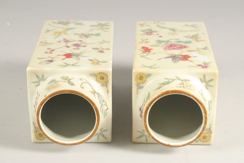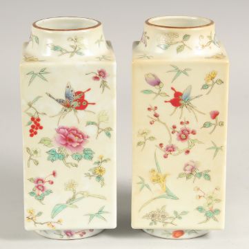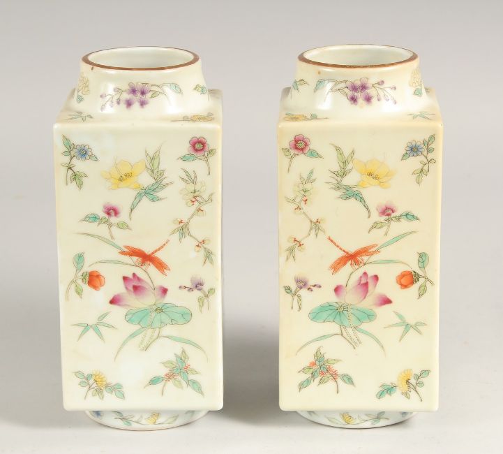 A PAIR OF CHINESE FAMILLE ROSE PORCELAIN SQUARE FORM VASES, painted all over with insects and flora, each base with four-character mark in red, 22cm high.