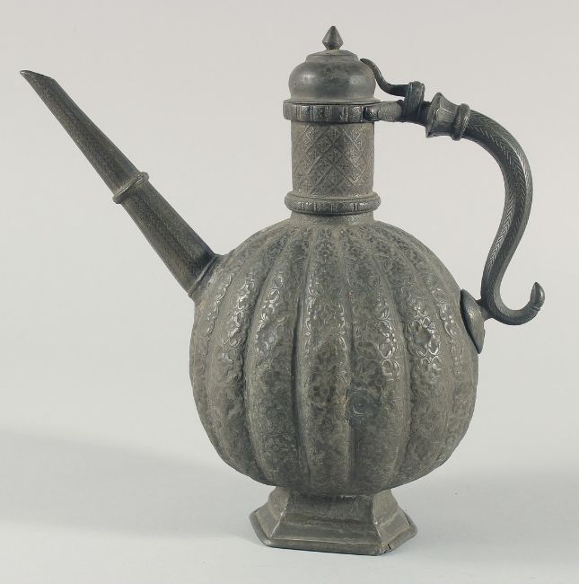 AN 18TH CENTURY MUGHAL INDIAN TINNED COPPER EWER, the ribbed body with embossed foliate decoration, 29.5cm high.