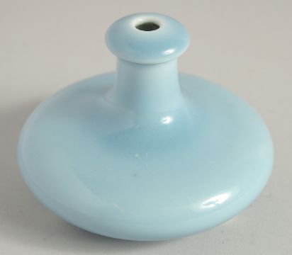 A SMALL CHINESE CLAIR-DE-LUNE POWDER BLUE GLAZE PORCELAIN VASE, on three moulded feet, with six-character mark, 8cm high.