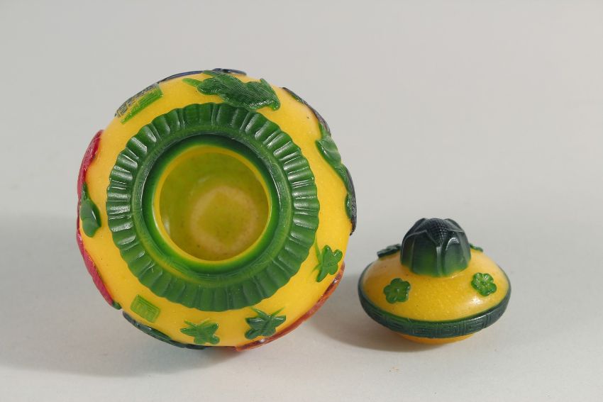 A CHINESE MULTICOLOURED GLASS JAR AND COVER, with raised decoration depicting monkeys on branches, bearing character mark to shoulder, 11.5cm high.