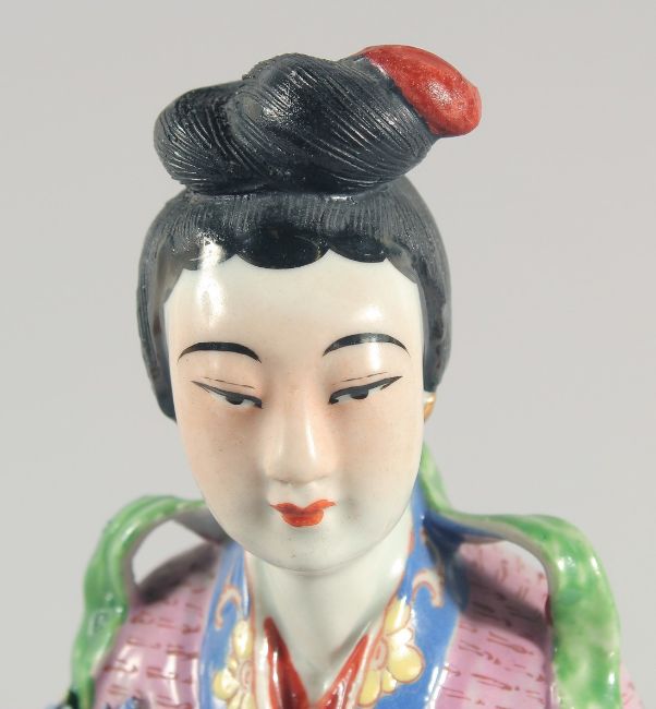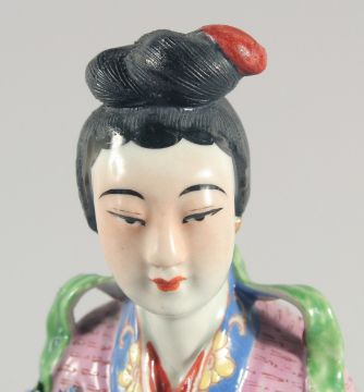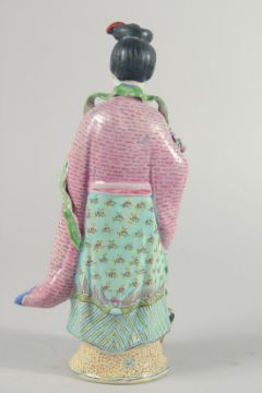 A CHINESE FAMILLE ROSE PORCELAIN FIGURE, of a robed female holding flowers, 31cm high.
