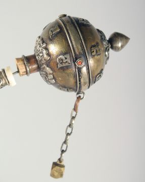A TIBETAN PRAYER WHEEL, with inscribed scroll inside, 21.5cm long.