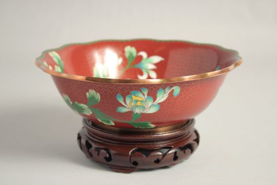 A GOOD CHINESE RED GROUND CLOISONNE BOWL, finely decorated with native flora, together with fitted hardwood stand. Bowl 20cm diameter