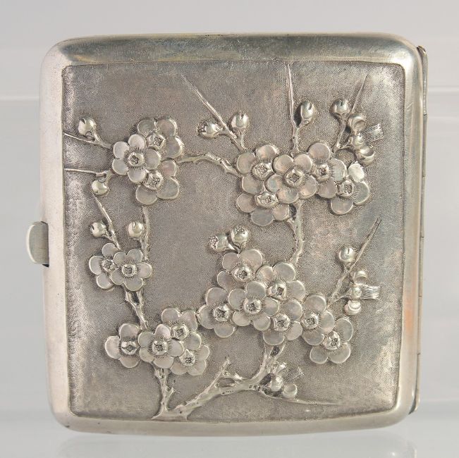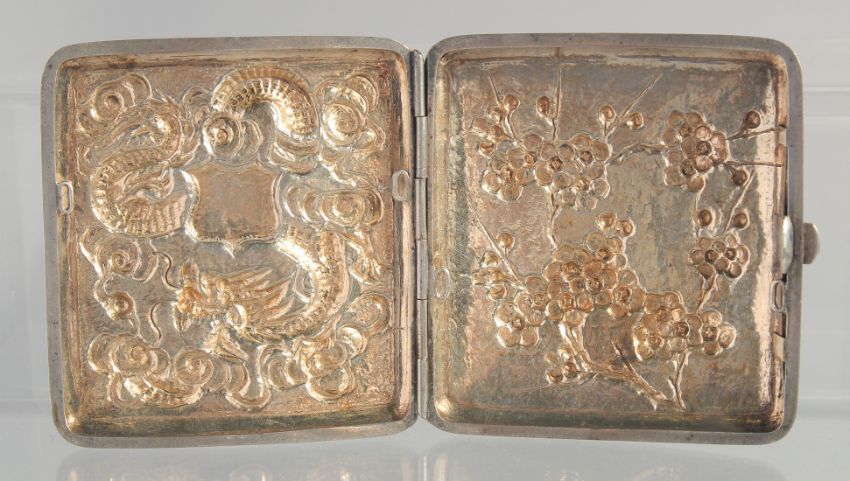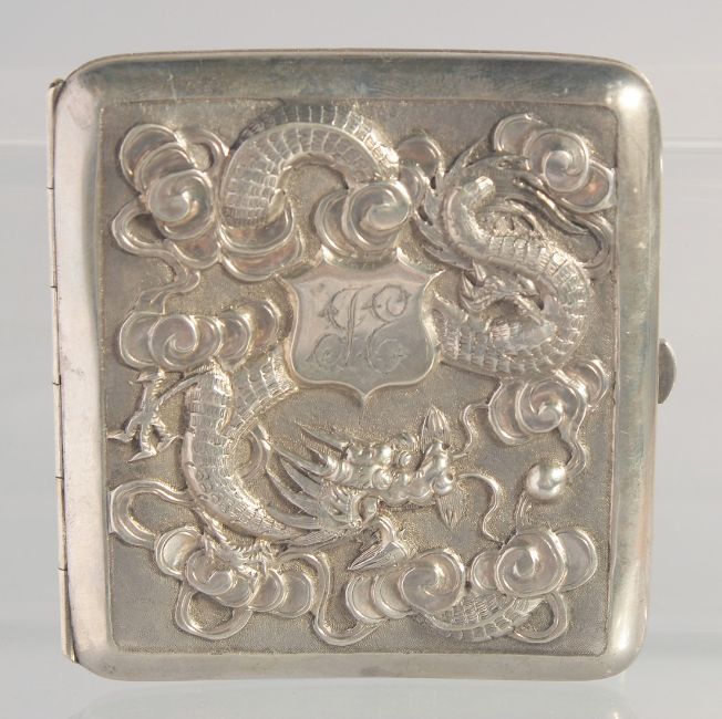 A 19TH CENTURY CHINESE REPOUSSE SILVER CIGARETTE CASE, with embossed dragon, makers mark to spring bar; CW, weight 100g, 8cm x 7.5cm.