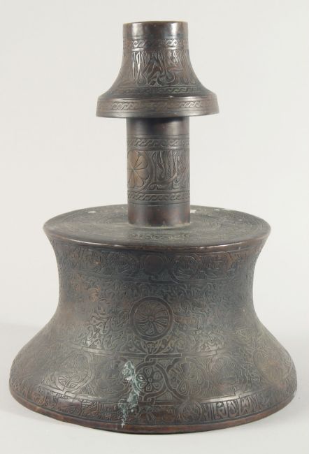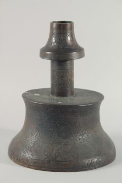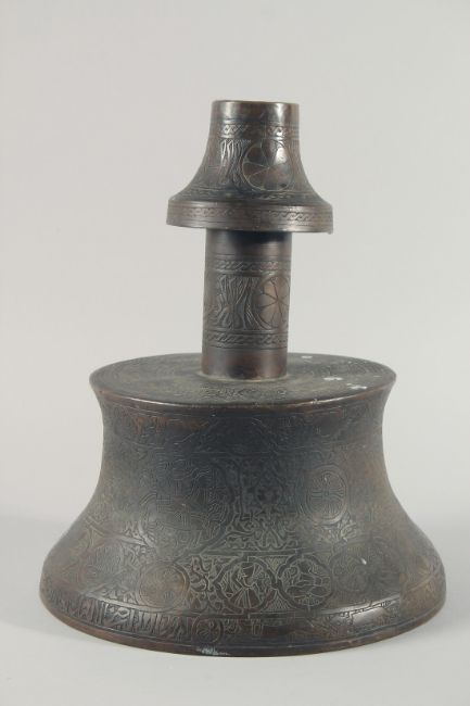 A VERY LARGE ISLAMIC ENGRAVED BRASS CANDLESTICK, with decorative roundels of floral motifs and calligraphy, 42cm high.