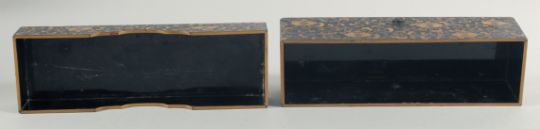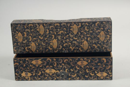 A JAPANESE GILT AND BLACK LACQUERED RECTANGULAR BOX, decorated with fan motifs and scrolling vine, 23cm x 7.5cm.