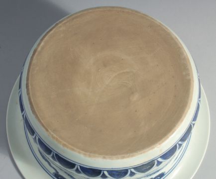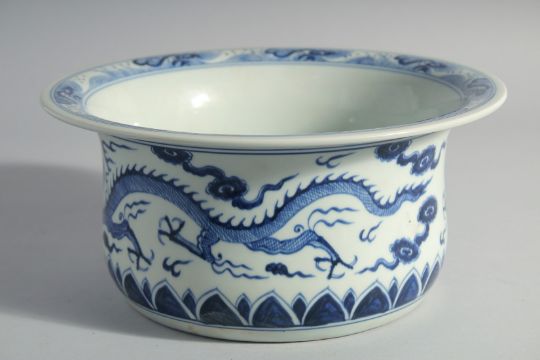 A CHINESE BLUE AND WHITE PORCELAIN BASIN, decorated with dragons, 26cm diameter.