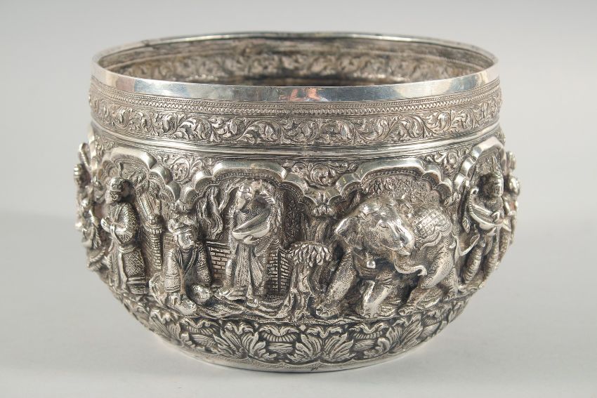 A LARGE BURMESE SILVER BOWL, with relief decoration depicting various figures, an elephant and mythological beast, the base with engraved and chased peacock, approx. 23cm diameter.