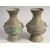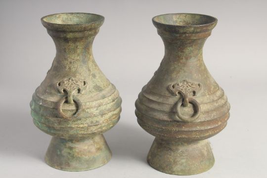 A PAIR OF BRONZE TWIN HANDLE VASES, each with characters and two bat formed drop-ring handles, 24cm high.