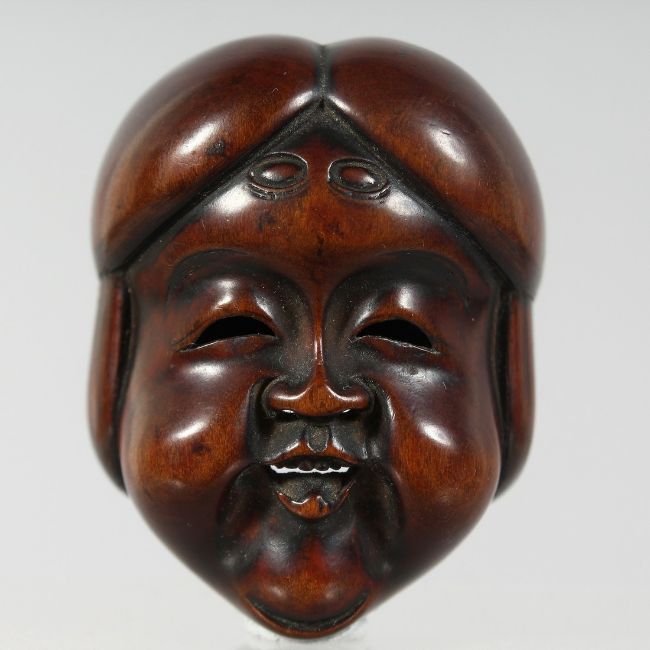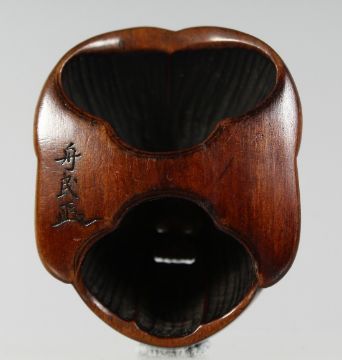 A JAPANESE CARVED WOODEN NOH MASK, signed to the reverse, 5cm x 4cm