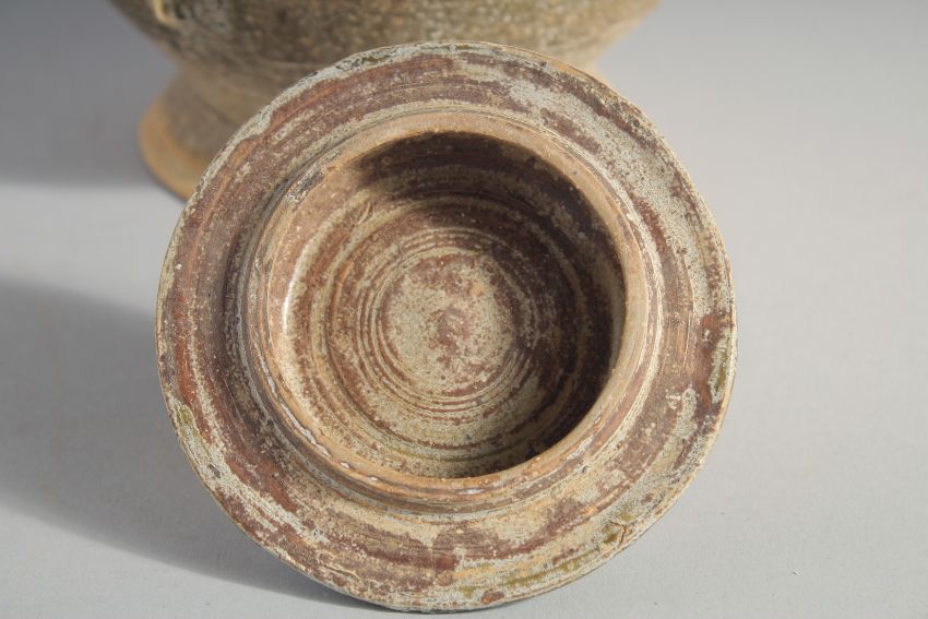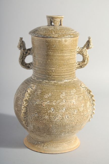 A CHINESE HAN STYLE POTTERY VASE AND COVER, with moulded twin handles, 28.5cm high.