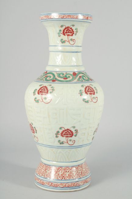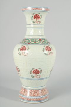 A LARGE CHINESE WUCAI PORCELAIN LOTUS VASE, with carved characters to the body, bearing a six-character mark, 42cm high.