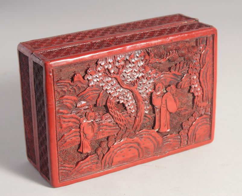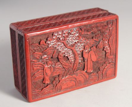 A CHINESE CINNABAR LACQUER RECTANGULAR BOX, the lid decorated with figures in an outdoor setting, 17.5cm x 12cm.
