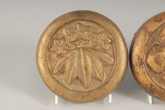 FOUR JAPANESE GILDED CAST METAL HANGING MON, each 15cm diameter, (4).