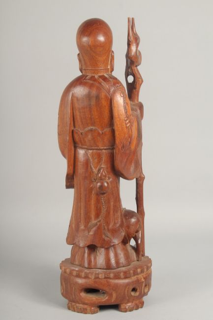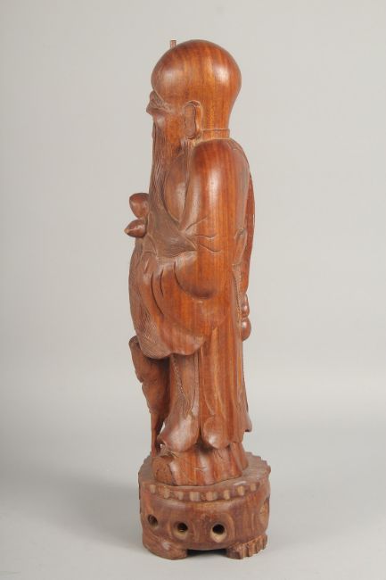 A LARGE CHINESE CARVED HARDWOOD FIGURE of an immortal holding a peach and a staff, 46.5cm high.
