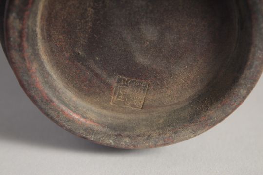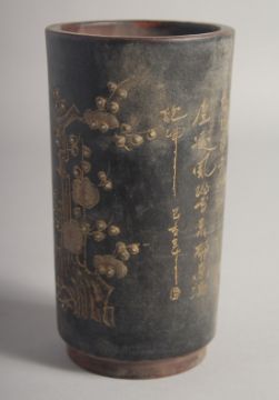 A CHINESE YIXING CYLINDRICAL BRUSH POT, with carved calligraphy, 15.5cm high.