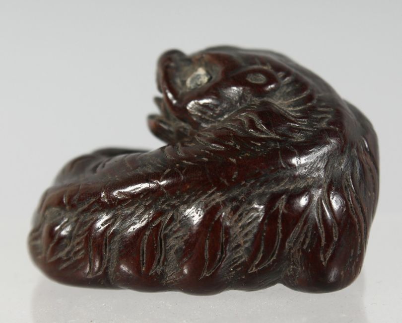 A JAPANESE CARVED WOODEN NETSUKE of a mythological beast, 4cm wide.