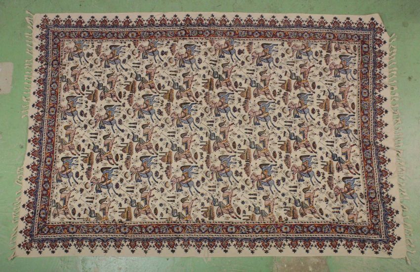 A PERSIAN STYLE MESHKAT HAND PAINTED TEXTILE, decorated with polo players, 146cm x 100cm.