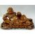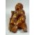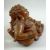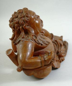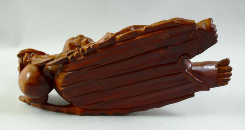 A LARGE CARVED HARDWOOD HOTEI, on a fitted carved hardwood stand, the figure reclining with a mythical dog at his side, the hotei and dog with inset eyes, overall 41cm wide.