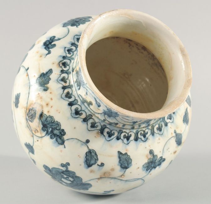A FINE 16TH/17TH CENTURY IZNIK STYLE PERSIAN SAFAVID GLAZED POTTERY VASE, painted with flower heads and scrolling vine, 26.5cm high.