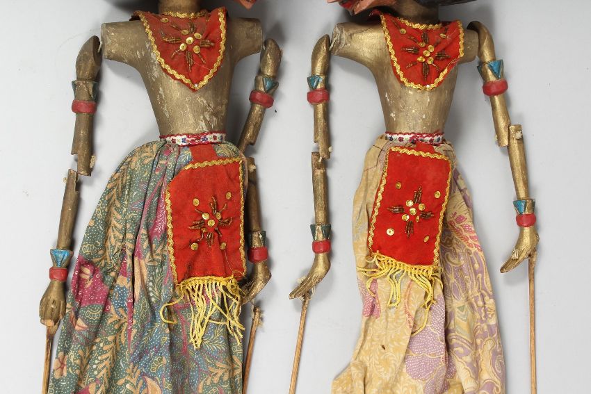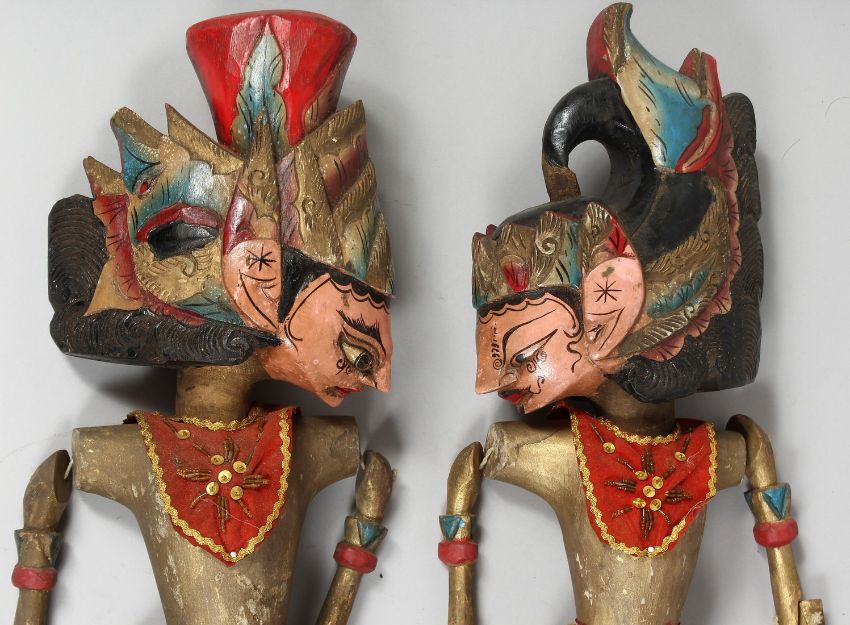 A PAIR OF BALINESE CARVED WOOD FOLK ART PUPPETS, carved figures approx. 57cm long.