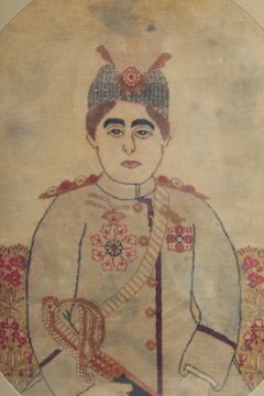 A FINE PERSIAN RAVAR KERMAN FRAMED RUG, depicting Ahmad Shah Qajar; the last ruler of the Qajar dynasty, framed, glazed, and with oval cut mount board, 100cm x 78cm overall.
