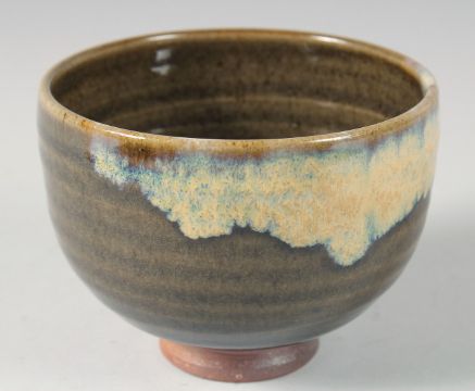 A CONTEMPORARY JAPANESE GLAZED POTTERY BOWL, signed, in original wooden box, bowl 12cm diameter.