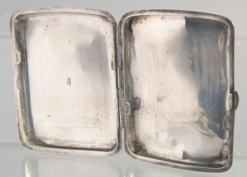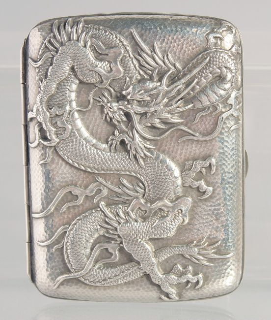 A JAPANESE MEIJI PERIOD REPOUSSE SILVER CIGARETTE CASE, decorated with a dragon, Junjin silver mark, weight 70g, 8.5cm x 6.5cm.