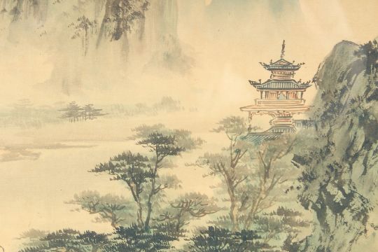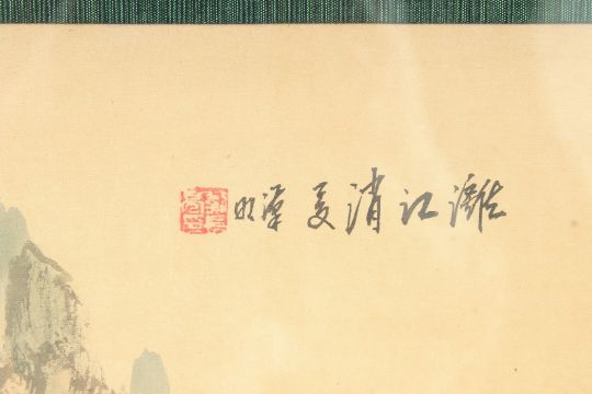 TWO CHINESE PAINTINGS ON PAPER, depicting mountainous landscapes, framed and glazed, together with a small Chinese embroidered textile, framed and glazed, (3).