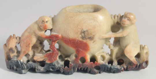 A CHINESE SOAPSTONE CARVING OF TWO MONKEYS, 16.5cm long.